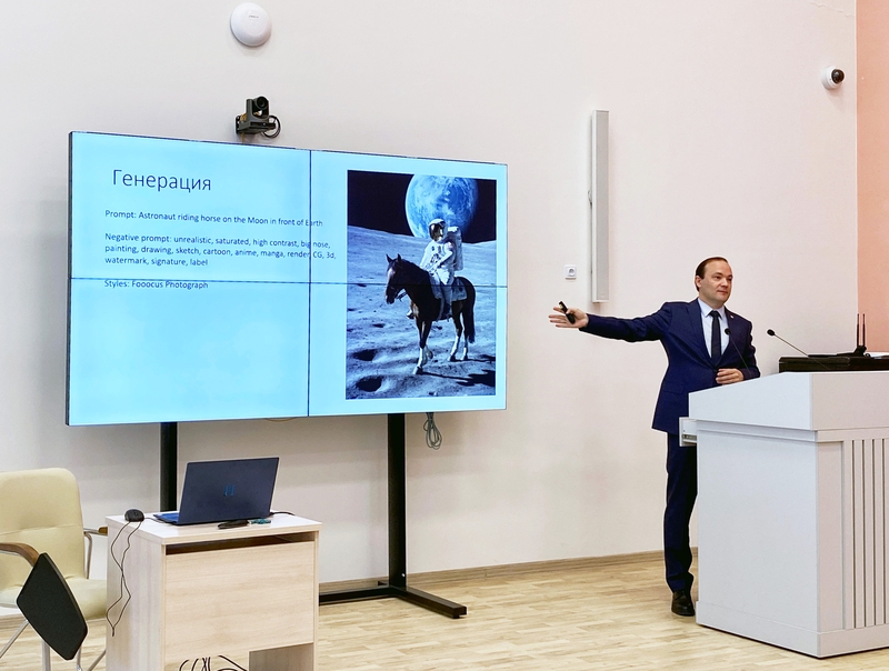 Он акцентировал внимание школьников на работе искусственной нейронной сети, подробно остановился на принципах создания промпта, а затем продемонстрировал возможности нейросетей, их преимущества и слабые места. Школьники узнали, как с помощью промптинга взаимодействовать с искусственным интеллектом по решению различных задач в обучении, творчестве, в поиске нужной информации и идей.